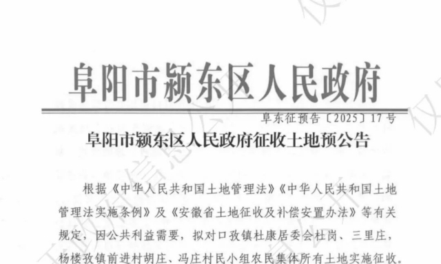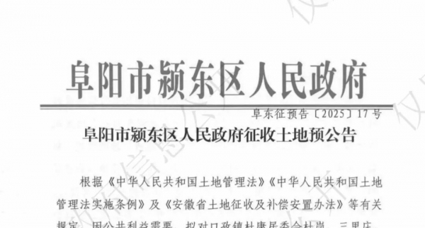 日前阜阳市自然资源和规划局发布征收土地预告 阜阳市颍东区人民政府征收土地公告(阜东征预告〔2025〕17号) 来源:阜阳